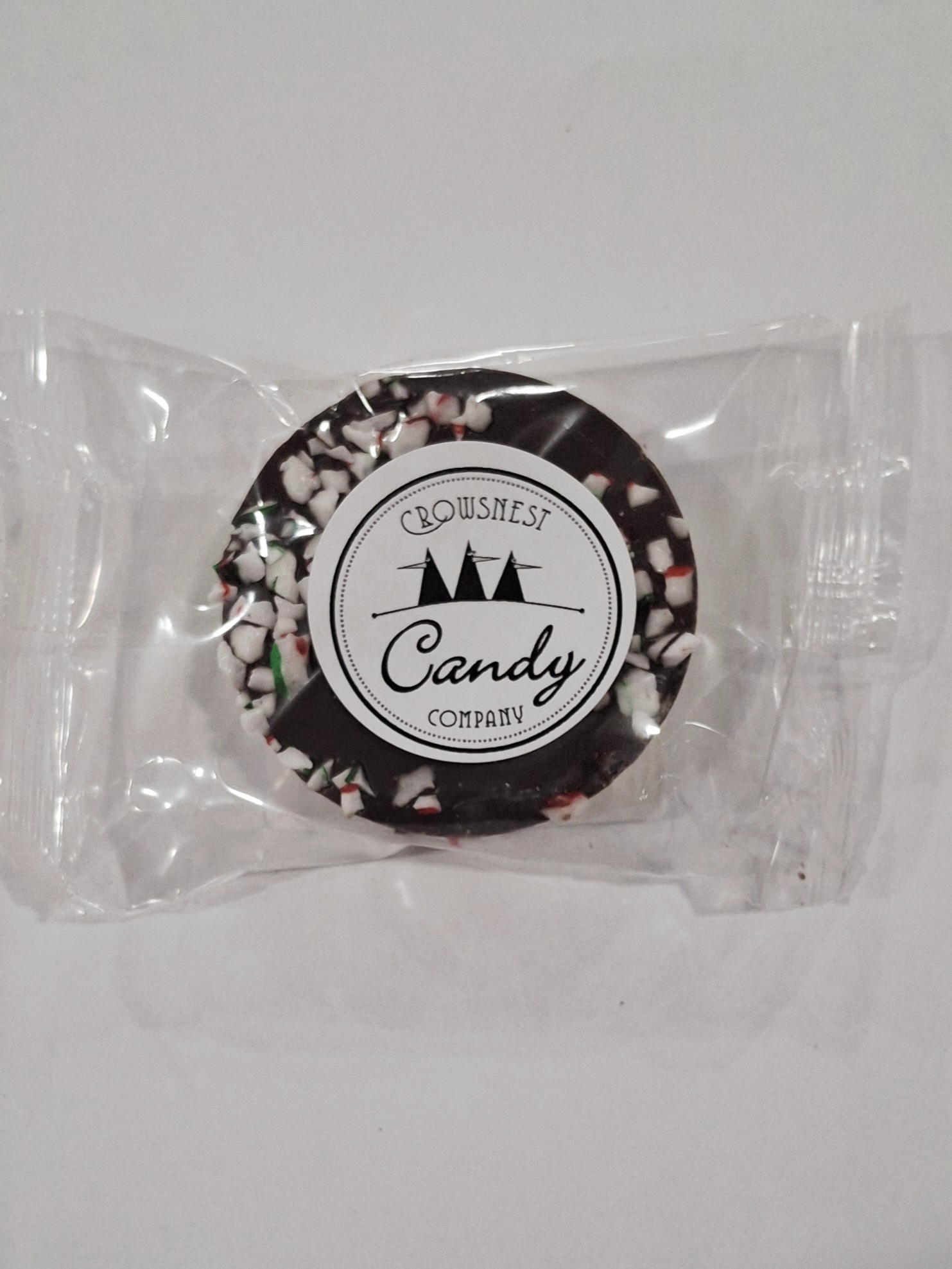 Dark and white chocolate coated Oreo cookie sprinkled with crushed peppermint pieces, a classic holiday flavour mixed with a classic cookie.