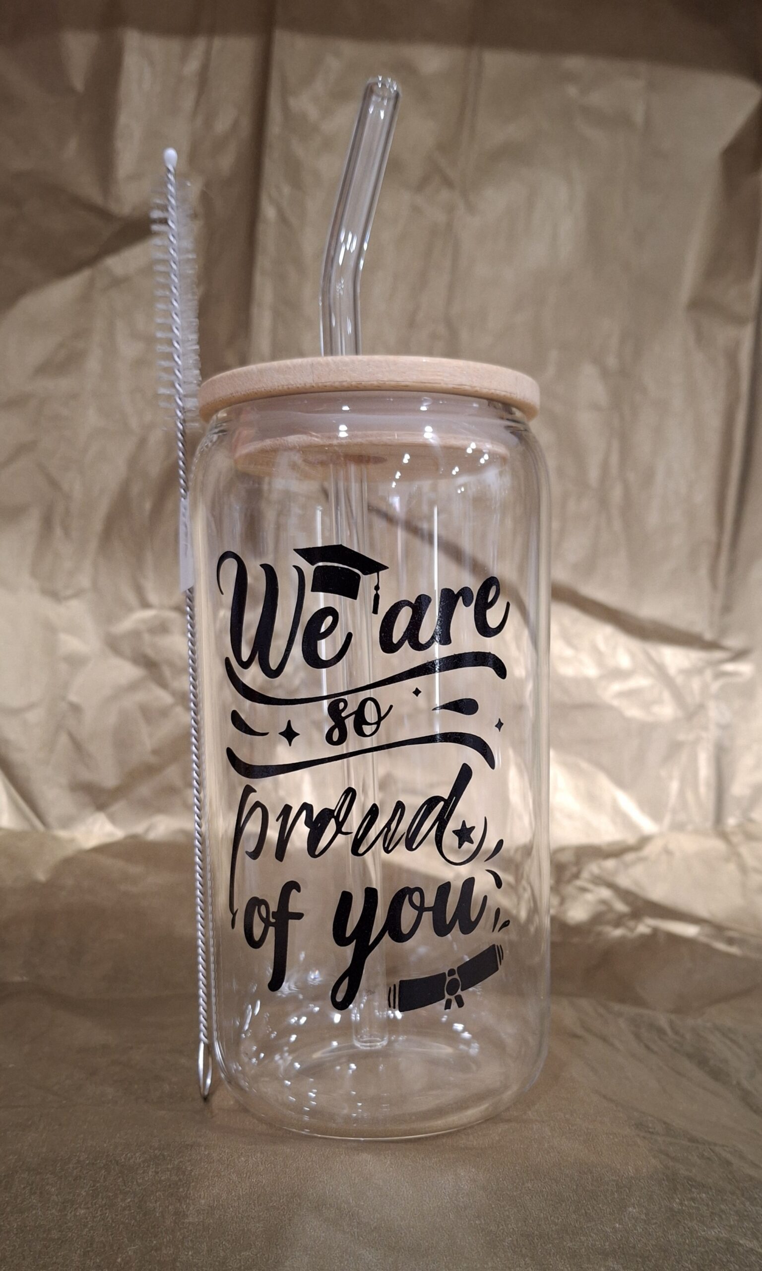 A reusable glass, comes with a glass straw, and a straw cleaner. Sayings for your Graduate, ‘We are so Proud of you” “the Tassel was worth the Hassle”, “Congrats Grad”, “Congrats, You Did it!”