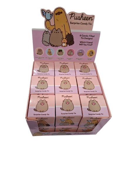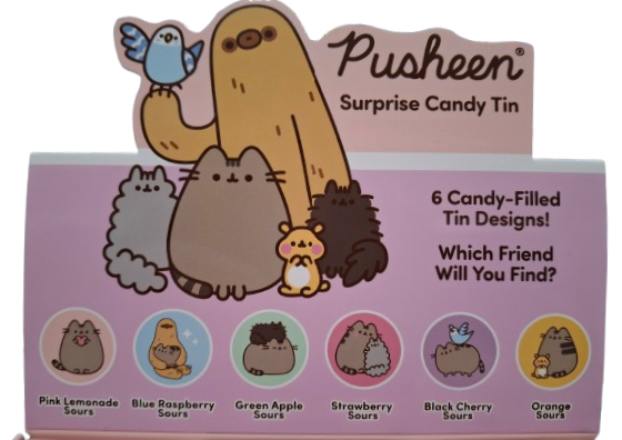 Boston America Pusheen Surprise tin. Pusheen is the famous lazy grey tabby cat from the animated web comic series. Now Pusheens’ friends have joined her, but who is who? Surprise! You will receive one of 6 characters; Pusheen, Stormy, Pip, Sloth, Bo, or Cheek in these collectible candy tins. 6 different sour flavours to find; Pink Lemonade, Blue Raspberry, Green Apple, Strawberry, Black Cherry, or Orange Sours