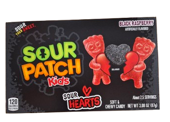 Sour Patch Kids Sour Hearts are soft, chewy, heart-shaped candies, perfect for Valentine’s, featuring the classic “first they’re sour, then they’re sweet” experience with a tangy fruit flavour like black raspberry offering a fun, shareable treat in movie-style boxes or bags for parties and gifts.
