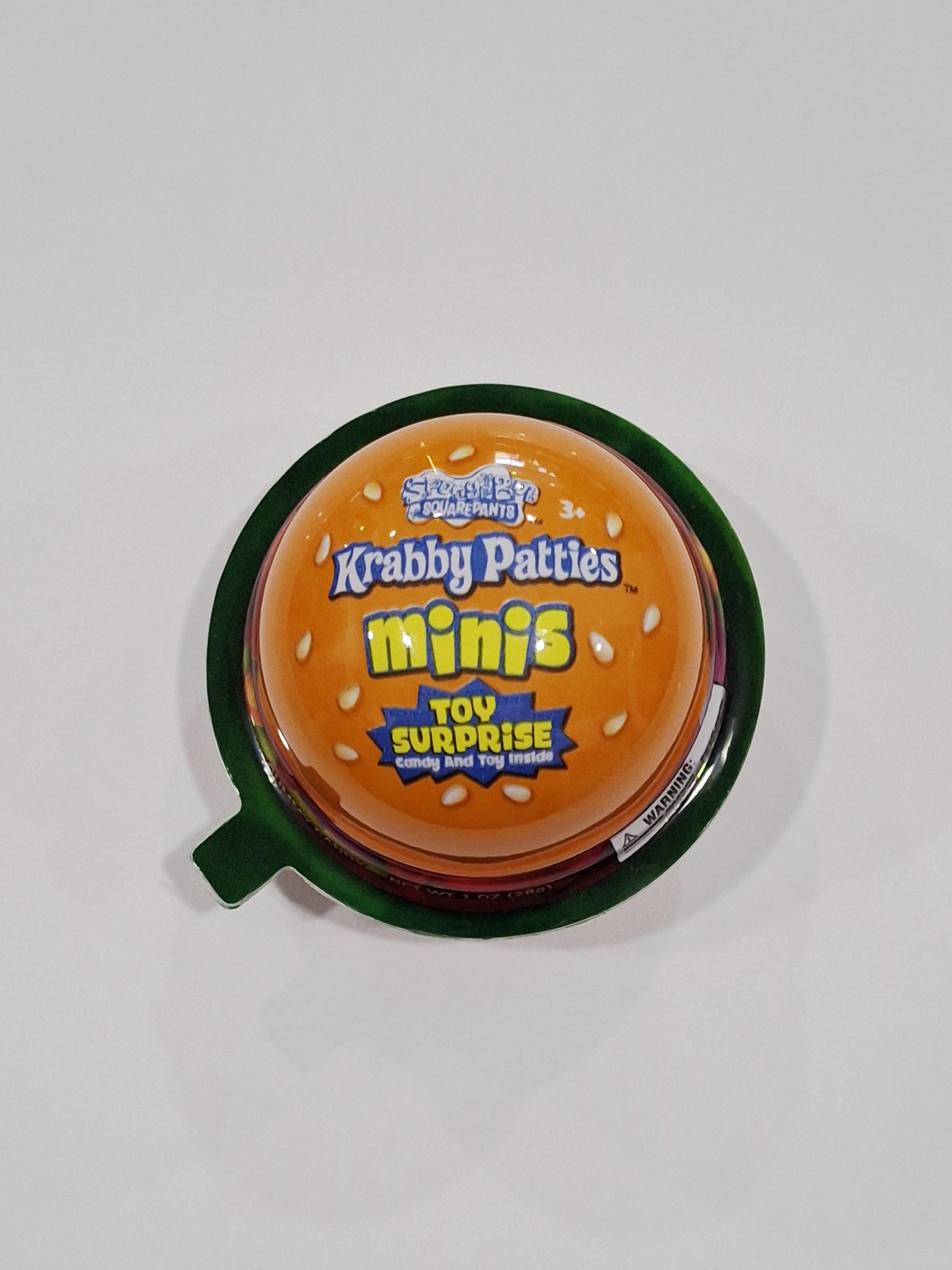 This chewy gummy hamburger is a mini-sized version of the Krabby Pattie! Candy and a toy surprise inside!