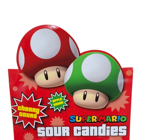 Super Mario Mushroom Power! Sour Apple and Sour Cherry candies inside these Mario Mushrooms.