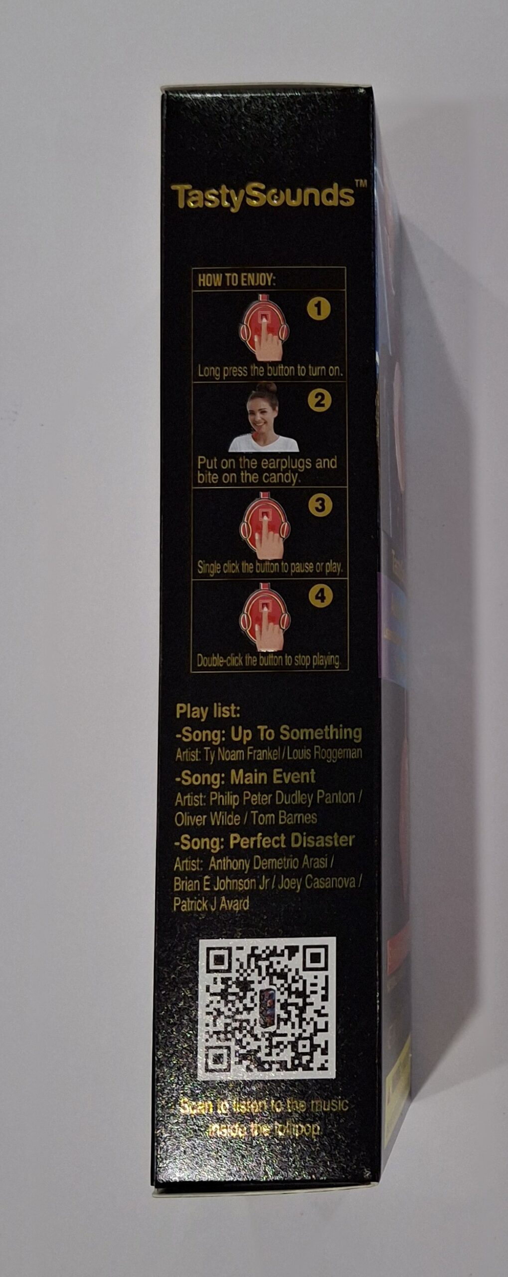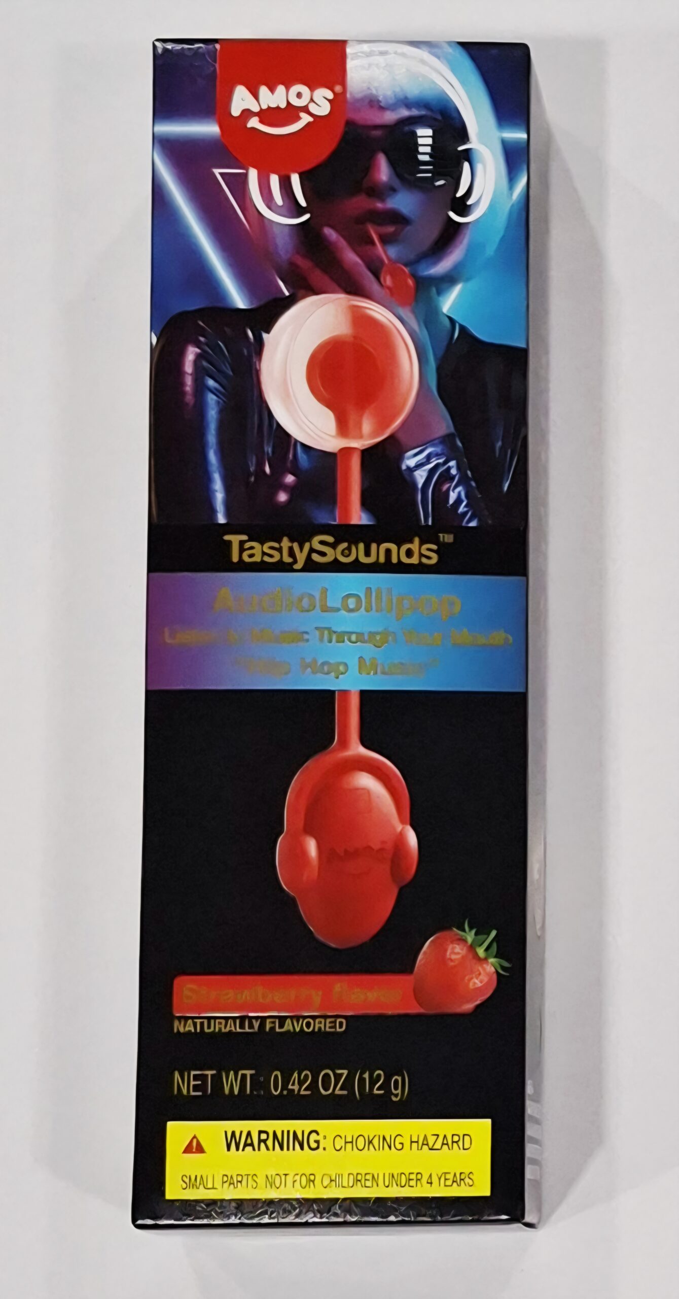 AMOS. ‘Taste and listen’ to up to 60 minutes of built in music! The lollipop is attached to a specialized stick containing a small electronic device. When you place the lollipop in your mouth and activate the button, the stick vibrates, sending sound waves through your jaw and teeth, which your brain interprets as sound. Only you can hear it! Strawberry flavoured lollipop=Hip Hop Music!