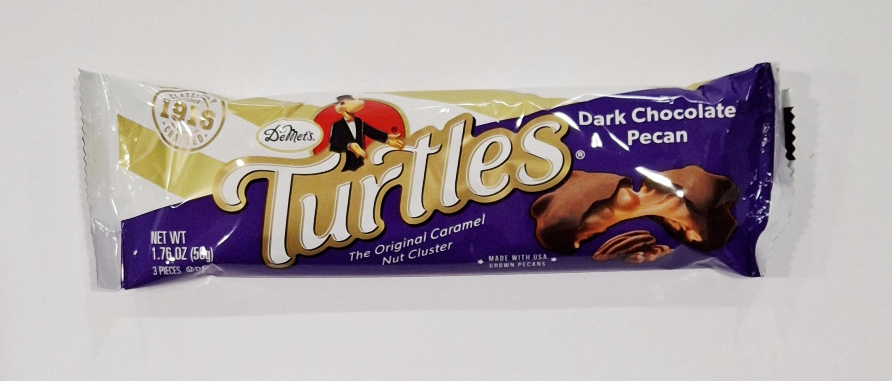 DeMets. The Original Caramel Nut Cluster, with dark chocolate, caramel and pecans. 3 Turtles per package.