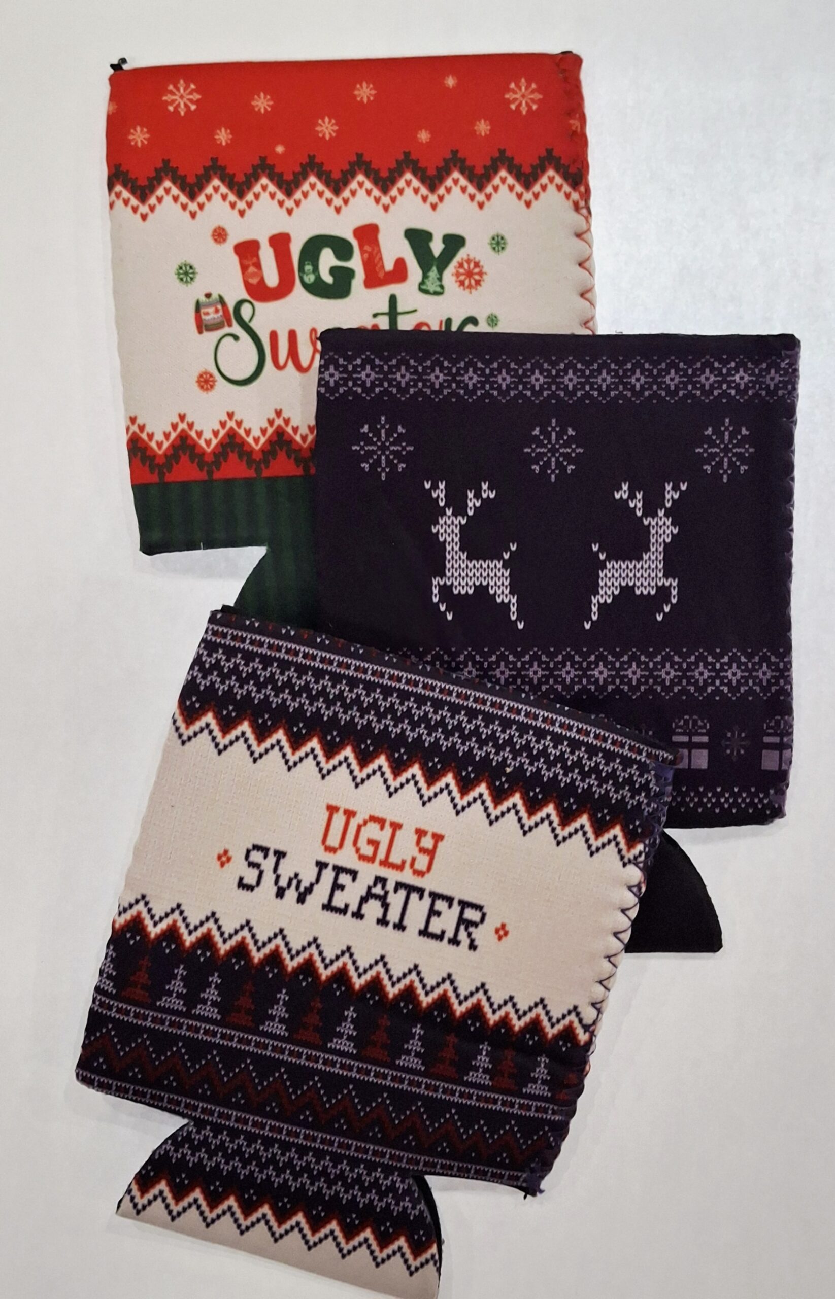 A festive and tacky, Christmas-themed sweater Koozie for your beverage. Brrrr! Keep it cold!